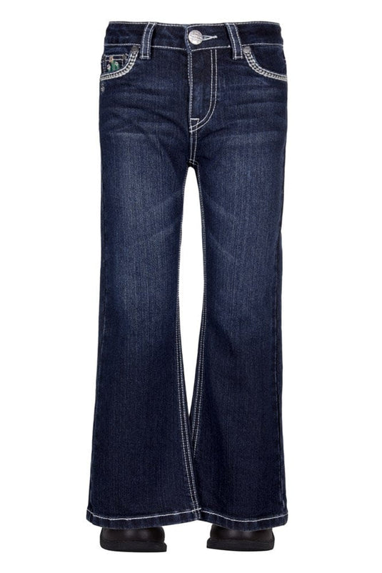 Boot Cut, Stretch for comfort and movement, Mid rise, Adjustable elastic waistband on all sizes, Logo shank button, Metal rivets, Woven logo label on back yoke, Feature embroidery on back pockets a...