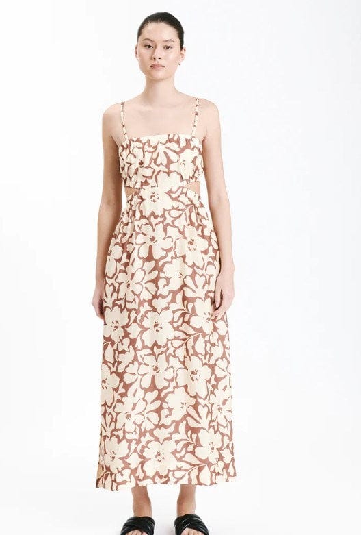 Made in our signature Cupro fabrication, printed with the exclusive Flores print. Silhouette is full with skirt length finishing just above the ankle. Features include elasticated cut outs on eithe...