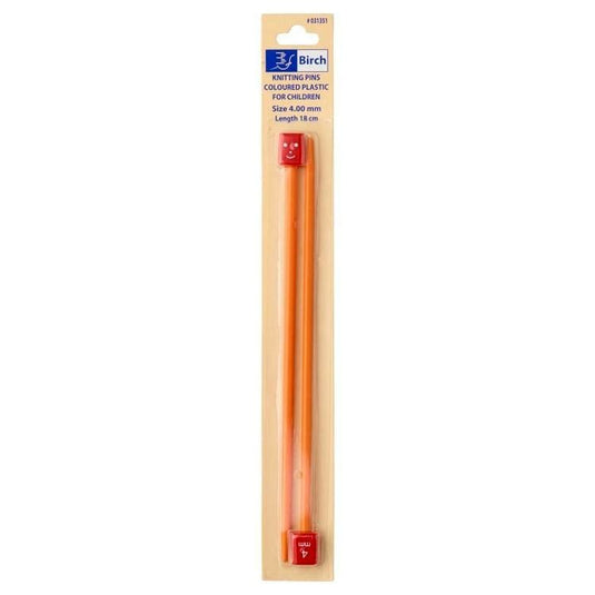 Safe plastic knitting pins for children in the colour orange and size 4.00mm x 18cm.