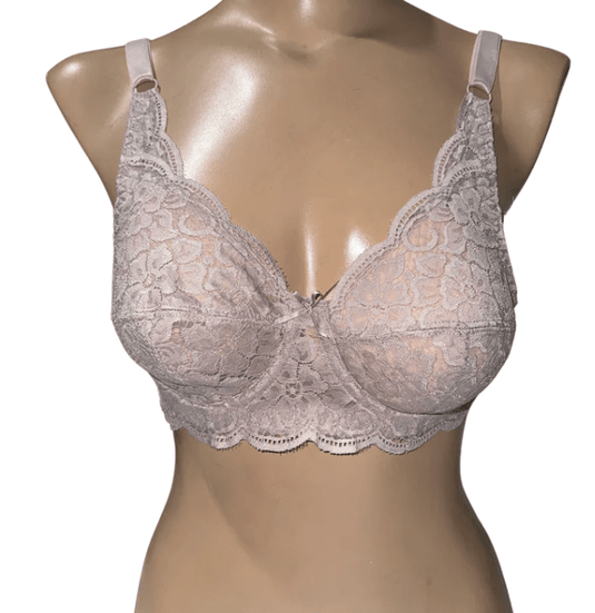 Nancy, our classic 'average-fit' bra with a floral lace along the neckline and front closure