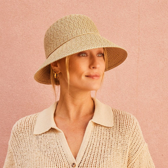 CANCER COUNCILThe Ora bucket, made from a blend of polyester and natural fibres, is a modern take on the traditional bucket with it's asymmetrical brim. The tonal cord around the crown, tied in a d...