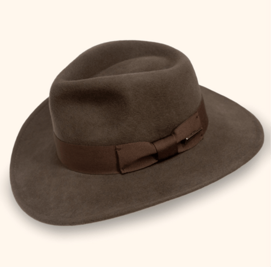 Wool felt outback style.100% crushable.Water repellantLined crown tipWelted brim edgeGrossgrain trim to match thebody of the colour.Indiana Jones hat pinColour: BrownBrim: 7.6cmSizes: S, M, L, XL