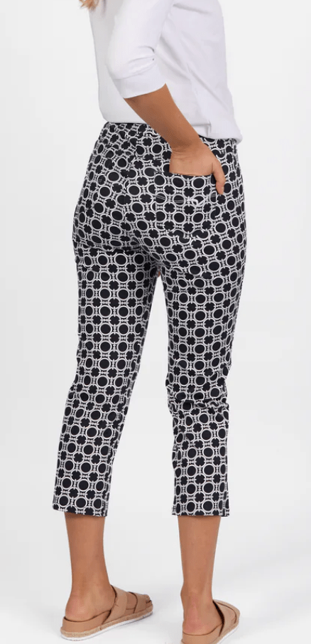 Vassalli Skinny Leg Ankle Grazer Printed Pant with Elastic Back Waist in Karma• Made from stretch fabric for the perfect fit• Waistband features metal 'V' logo jean button closure, two front beltl...