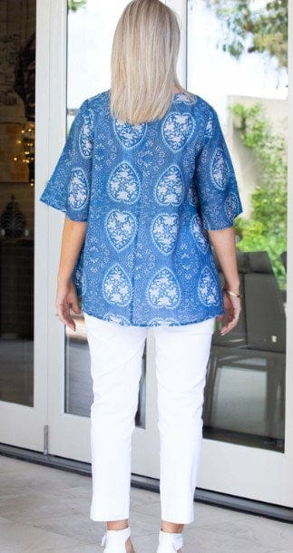 Flutter bell half sleeve Heart floral Print Relaxed topBlue and sky highlights floral PrintSingle Layer Flutter Bell SleeveBack neck key hole opening with dyed to match button and fine loop closure...
