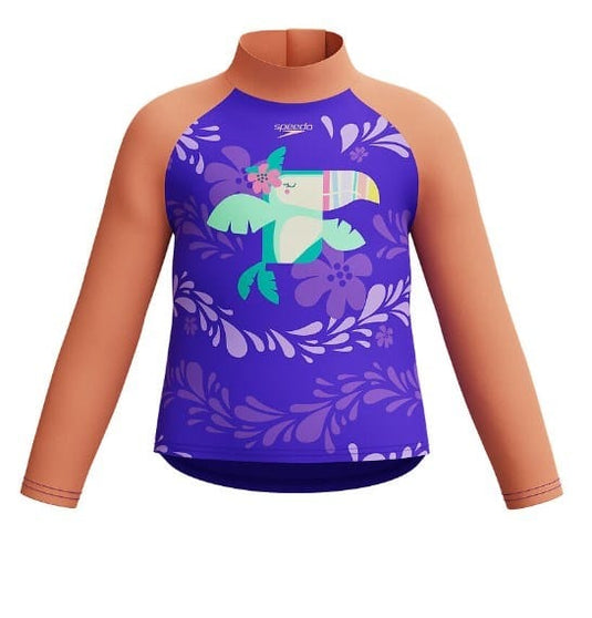 Lock in some wave-jumping fun wearing our toucan print long-sleeve rash top. A zip-up back (up to 4 years) aids changing, and the dipped back hem keeps them protected as they bend and stretch. Upf4...