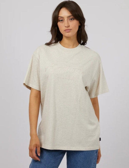 All About Eve Classic Tee features a vintage style wash with a branded chest embroidery. Styled back with denim jeans and sneakers for a chic weekend vibe.