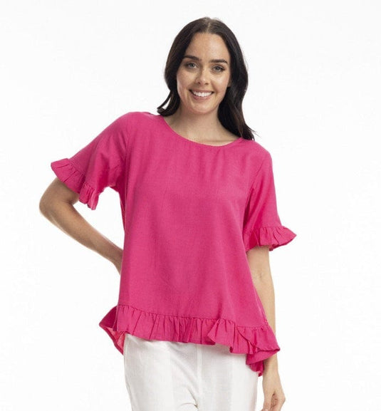 FabricLinen BlendDescriptionBrighten your style with our gorgeous frill top. Featuring a relaxed fit, it showcases beautiful colour and style. The playful ruffled sleeves and hem add a touch of whi...